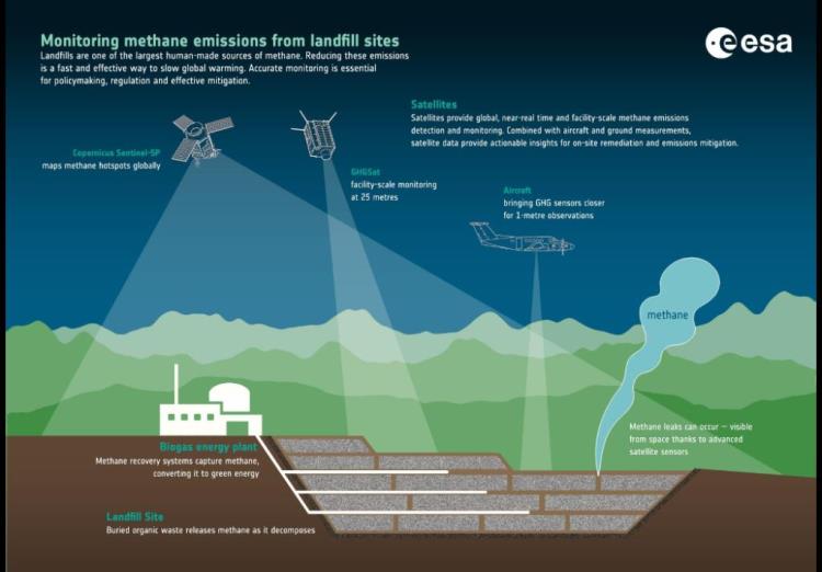 L'entreprise canadienne GHGSat gère d'ici la fin de 2025 une constellation de seize satellites dédiés à la surveillance précise des émissions industrielles. Leurs instruments survolent régulièrement des champs pétroliers et gaziers, des mines de charbon, des aciéries, mais aussi un nombre croissant de décharges à travers le monde. Les données qu'ils collectent servent aussi bien aux clients commerciaux, qui souhaitent identifier les pertes de méthane comme une opportunité économique, qu'aux organismes publics, qui surveillent si les réductions d'émissions ont réellement été réalisées.