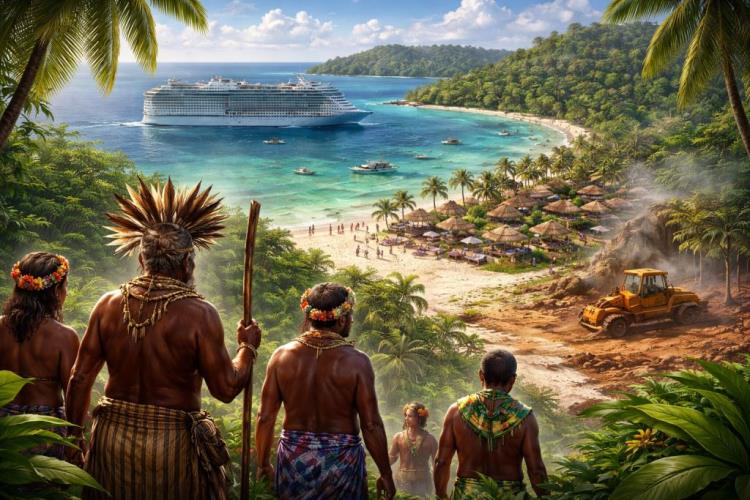 Le projet de l’opérateur de croisières américain Royal Caribbean de construire sur l’île de Lelepa, au Vanuatu, un beach club privé pour les passagers de croisière a soulevé une nouvelle question qui dépasse un différend local autour d’un seul investissement touristique. Au cœur du différend se trouvent désormais le rapport à la terre et à la mer, la protection du patrimoine culturel, le droit des communautés locales à une participation réelle à la prise de décision, ainsi que les limites du modèle de développement dans les petits États insulaires fortement dépendants du tourisme. Alors que la compagnie présente le projet comme une nouvelle opportunité de développement pour la population locale et le Pacifique Sud, une partie des dirigeants autochtones avertit que la documentation présentée jusqu’à présent n’a pas apporté de réponses suffisamment claires à une série de questions essentielles.