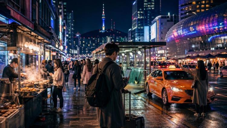 Taksi je u Seulu važna noćna opcija, no nije uvijek dovoljan samo znak rukom uz cestu. Gradske upute navode da se taksi može zaustaviti na ulici, na taksi stajalištu ili preko mobilne aplikacije. Na vjetrobranskom staklu taksija prikazuje se status vozila: oznaka za slobodan taksi obično je prikazana crveno, dok oznaka rezerviranog vozila znači da taksi već ima vožnju. Za posjetitelje koji ne čitaju korejski, razlika u boji i pripremljena destinacija mogu spriječiti nesporazume. Korisno je imati naziv hotela, adresu i najbližu veću znamenitost napisane na korejskom, jer se ne može računati na to da će svaki vozač govoriti strani jezik.